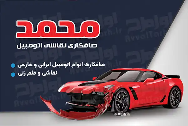 کارت ویزیت لایه باز صافکاری و نقاشی ، در طرح از تصویر دوربری شده ماشین تصادفی ، تصویر با کیفیت نقاشی اتومبیل استفاده شده است.