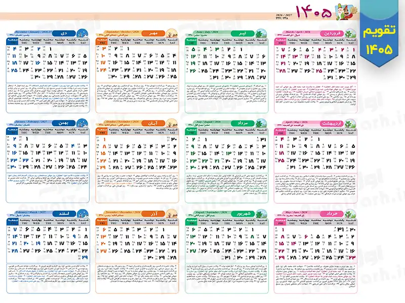 در طرح psd تقویم 1405 مناسبت های ملی و مذهبی سال مطابق با مرکز تقویم موسسه ژئو فیزیک دانشگاه تهران قرار گرفته است.
