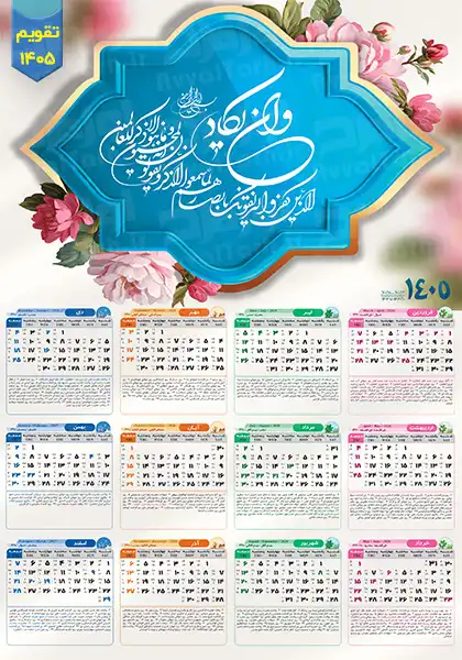 طرح لایه باز تقویم دیواری 1405 با طرح آیه و ان یکاد فرمت psd و به صورت لایه باز طراحی شده است، در حقیقت به سادگی و بدون افت کیفیت می توانید فایل تقویم را به سایز دلخواهتان تبدیل کرده و با قراردادن تبلیغ در بالا، آن را چاپ کنید. در طرح تقویم سال 1405 وکتور گل های زیبا و جزئیات دقیق مناسبت های ملی و مذهبی در طرح تقویم چهارصد و پنج استفاده شده است.