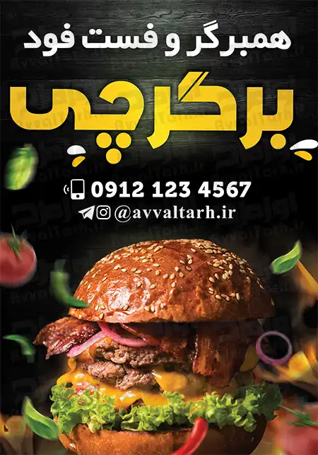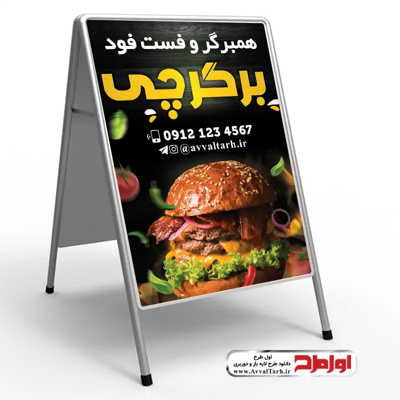 ویژگیهای طرح تابلو تاشو لایه باز همبرگر فروشی