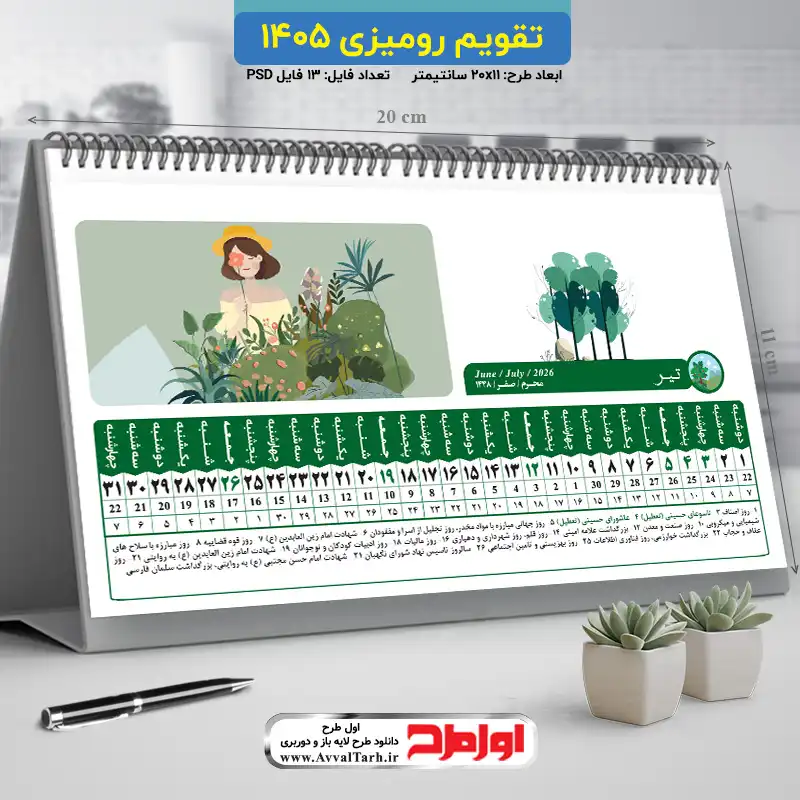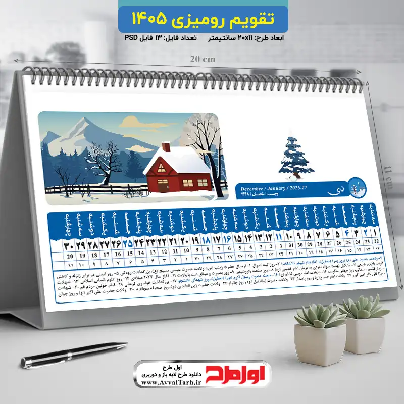 این طرح تقویم خام 1405 در ابعاد 20 در 11 سانتیمتر و رزولوشن 300dpi طراحی شده که با ویرایش و تغییر به سایز مورد نظر خود در برنامه فتوشاپ، میتوانید بدون افت کیفیت برای چاپ تقویم رومیزی از آن استفاده کنید.