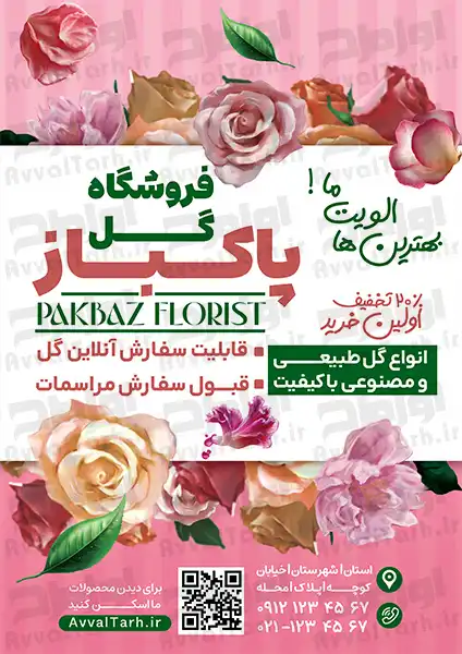 طرح تراکت لایه باز گل فروشی، این طرح را با کیفیت بالا چاپ کرده و به عنوان یک پوستر کاربردی و شیک از آن استفاده کنید. در این طرح از تصویر png گل و شیپ با کیفیت استفاده شده است. طراح به راحتی می تواند در نرمافزار فتوشاپ المان های مختلف این طرح را ویرایش کرده و جزئیات دلخواه خود را به آن اضافه کند.