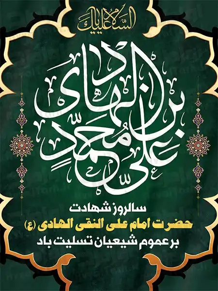 دانلود طرح پوستر شهادت امام هادی، را می توانید در ابعاد مختلف چاپ کرده و برای نصب در هیئتهای مذهبی، مساجد، حسینیهها، مهدیهها و اماکن عمومی با هدف برپایی مراسم سوگواری ویژه شهادت امام علی النقی الهادی (ع) استفاده کنید. در طرح پوستر شهادت امام هادی از تصویر png شمسه، تایپوگرافی، کادر اسلیمی با کیفیت و متن تسلیتی به کار رفته است.