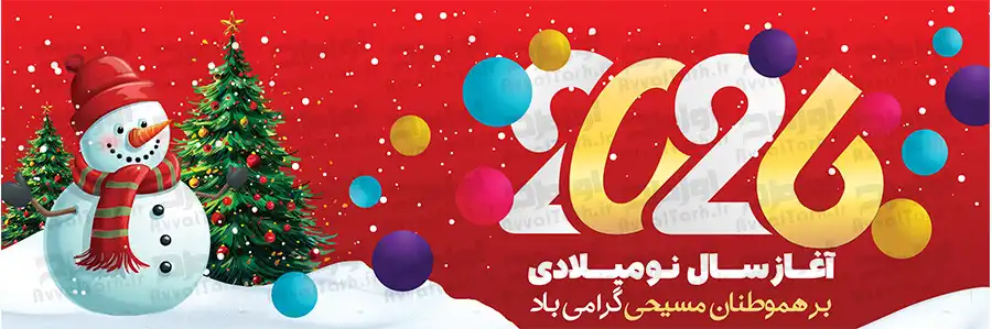 طرح بنر آغاز سال 2026 میلادی، را می توانید در ابعاد مختلف چاپ کرده و برای نصب در اماکن عمومی با هدف برپایی مراسم جشن آغاز سال نو استفاده کنید. در طرح پلاکارد آغاز سال 2026 میلادی از تصویر وکتوری درخت کریسمس، تصویر png آدم برفی، دوربری تزئینات کریسمس و متن تبریک آغاز سال نو به کار رفته است.