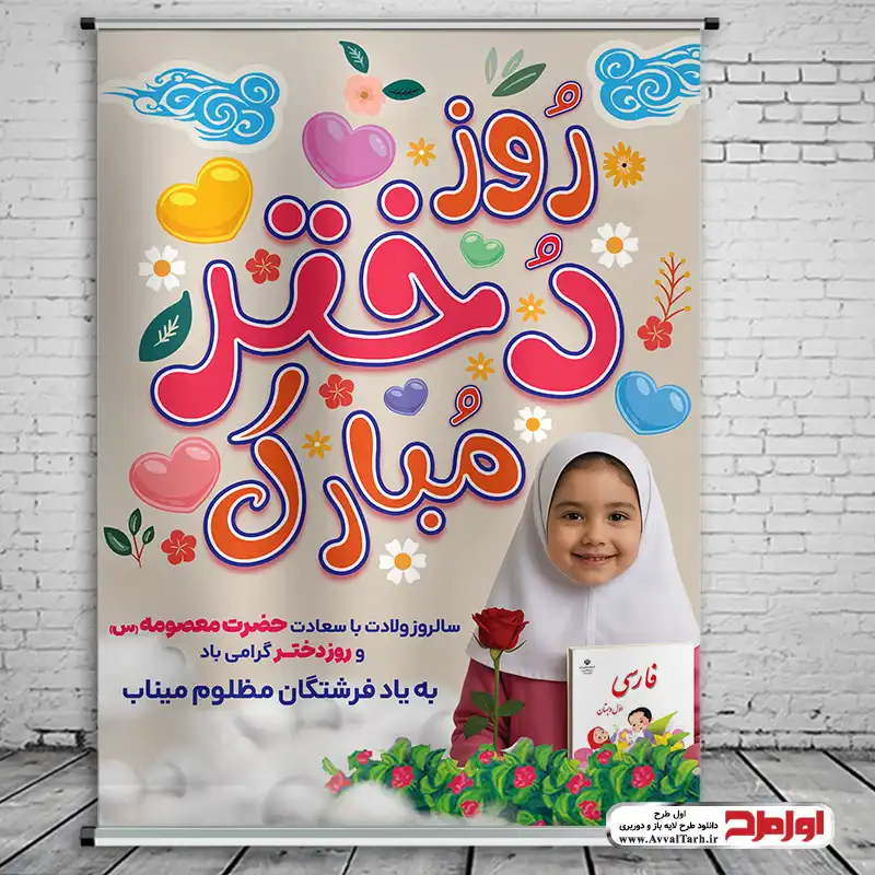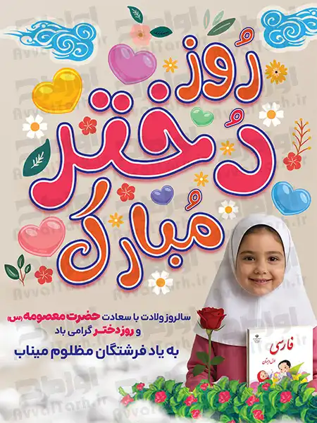 طرح لایه باز بنر روز دختر، را می توانید در ابعاد مختلف با کیفیت بالا چاپ کرده و برای برپایی جشن ولادت حضرت معصومه در مساجد و معابر عمومی نصب کنید. در طرح لایه باز بنر ولادت حضرت معصومه و روز دختر از تصویر وکتوری دختر بچه دبستانی (به یاد دختران مظلوم میناب)، تصویر png گل و شیپ با کیفیت استفاده شده است. طراح به راحتی می تواند در نرمافزار فتوشاپ المان های مختلف این طرح را ویرایش کرده و جزئیات دلخواه خود را به آن اضافه کند.
