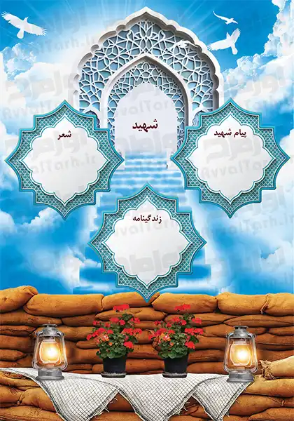 طرح بنر پانل شهدا، این طرح را می توانید در ابعاد مختلف چاپ کرده و در کریدور مدرسه برای اطلاع رسانی به دانش آموزان آن را نصب کنید. در این طرح از تصویر png سنگر و فانوس، تصویر وکتوری کبوتر و شیپ با کیفیت برای معرفی شهید و زندگینامه شهید در آن استفاده شده است.