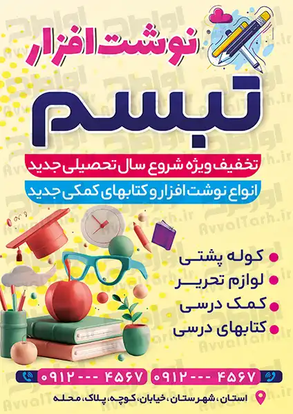 طرح تراکت لوازم التحریری، این طرح را با کیفیت بالا چاپ کرده و به عنوان یک پوستر کاربردی و شیک از آن استفاده کنید. در این طرح از عکس وکتوری لوازم التحریر، تصویر png مداد و شیپ با کیفیت استفاده شده است. طراح به راحتی می تواند در نرمافزار فتوشاپ المان های مختلف این طرح را ویرایش کرده و جزئیات دلخواه خود را به آن اضافه کند.