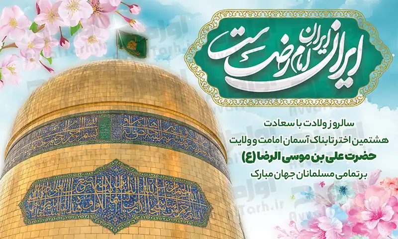 دانلود طرح پوستر ولادت امام رضا، را می توانید در ابعاد مختلف با کیفیت بالا چاپ کرده و برای برپایی جشن ولادت امام رضا در مساجد و معابر عمومی نصب کنید. در طرح لایه باز بنر ولادت امام رضا از تصویر png گنبد حرم امام رضا، تایپوگرافی «ایران، ایران امام رضاست»، وکتور گل های بهاری و کادر اسلیمی استفاده شده است. طراح به راحتی می تواند در نرمافزار فتوشاپ المان های مختلف این طرح را ویرایش کرده و جزئیات دلخواه خود را به آن اضافه کند.