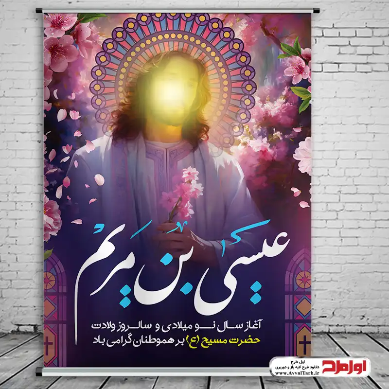 طرح پوستر ولادت حضرت مسیح، را می توانید در ابعاد مختلف چاپ کرده و برای نصب در اماکن عمومی با هدف برپایی مراسم جشن میلاد حضرت مسیح استفاده کنید. در طرح پوستر ولادت حضرت عیسی بن مریم از تصویر وکتوری شمایل حضرت مسیح، تصویر png گل، تایپوگرافی «یا عیسی بن مریم» و متن تبریک ولادت حضرت مسیح به کار رفته است.