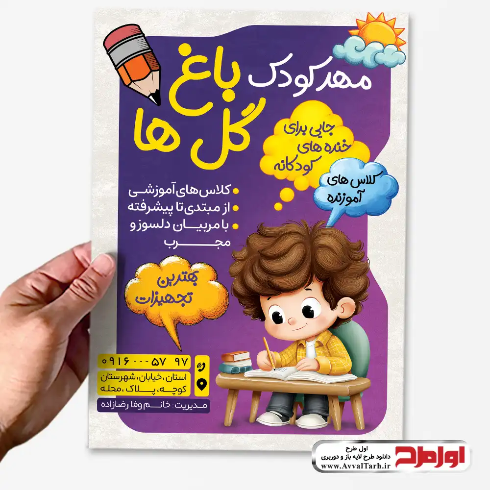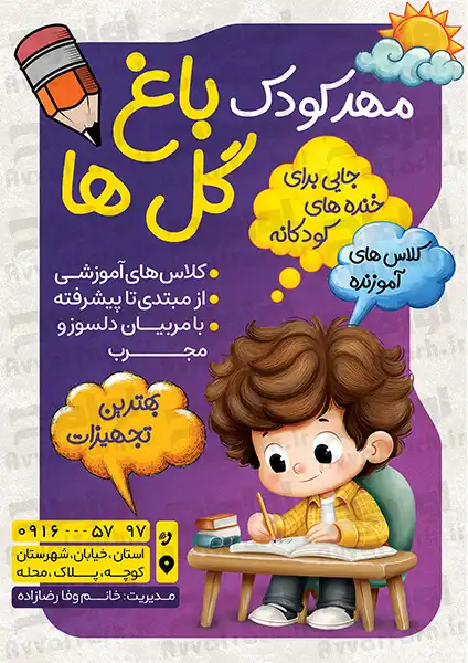 طرح لایه باز تراکت مهدکودک، این طرح را با کیفیت بالا چاپ کرده و به عنوان یک پوستر کاربردی و شیک از آن استفاده کنید. در این طرح از تصویر کارتونی پسر بچه پشت میز در حال مشق نوشتن، وکتور ابر و خورشید، تصویر png مداد و شیپ با کیفیت استفاده شده است. طراح به راحتی می تواند در نرمافزار فتوشاپ المان های مختلف این طرح را ویرایش کرده و جزئیات دلخواه خود را به آن اضافه کند.