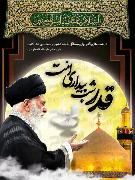 در طرح لایه باز بنر شب قدر با تصویر آیت الله خامنه ای، این طرح را با کیفیت بالا چاپ کرده و به عنوان یک پوستر کاربردی و شیک در مساجد و معابر عمومی از آن استفاده کنید. در این طرح از تصویر با کیفیت گنبد و گلدسته حرم مطهر حضرت علی، تایپوگرافی «قدر شب بیداری امت»، تصویر png ماه، سخن شهید آیت الله خامنه ای، تصویر بدون پس زمینه شهید رهبر و شیپ با کیفیت استفاده شده است. طراح به راحتی می تواند در نرمافزار فتوشاپ المان های مختلف این طرح را ویرایش کرده و جزئیات دلخواه خود را به آن اضافه کند.