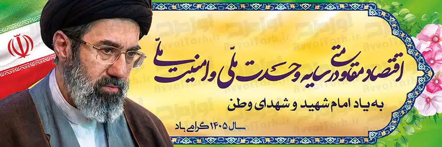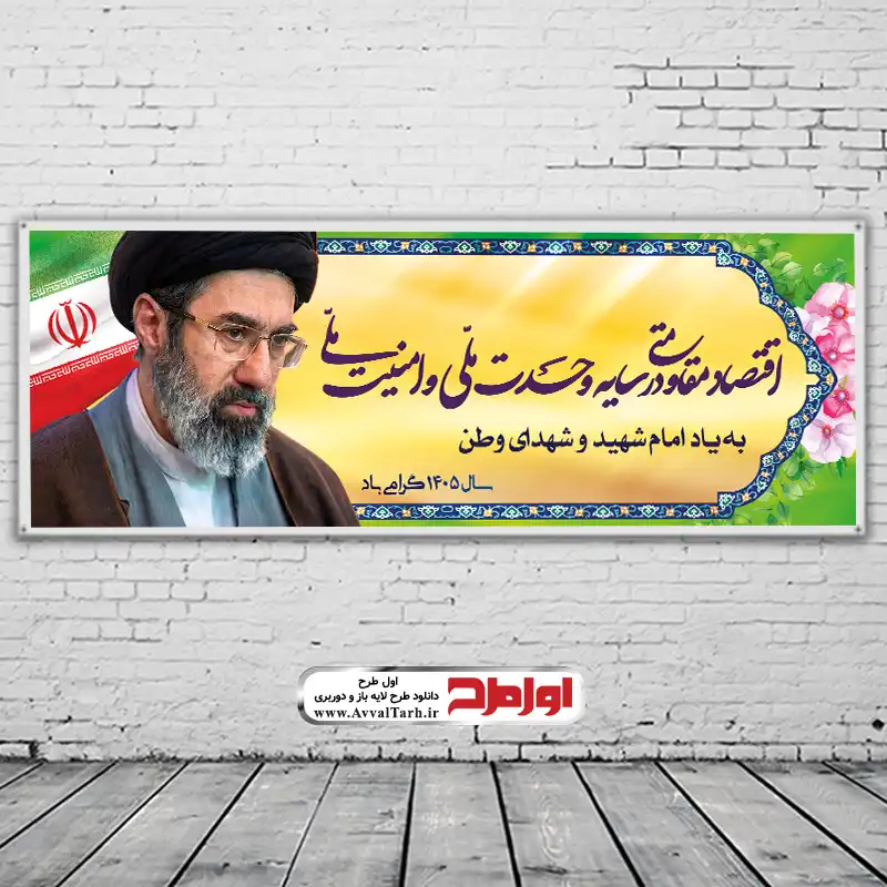 طرح لایه باز بنر شعار سال 1405 با عکس سید مجتبی حسینی خامنه ای به صورت لایه باز طراحی شده است. این طرح را می توانید در ابعاد مختلف بنر، پوستر، بیلبورد، پلاکارد و... چاپ کرده و برای تبریک سال 1405 استفاده کنید.