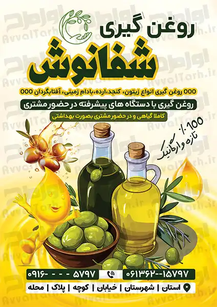 دانلود طرح تراکت روغن گیری، این طرح را با کیفیت بالا چاپ کرده و به عنوان یک پوستر کاربردی و شیک از آن استفاده کنید. در این طرح از عکس با کیفیت شیشه روغن زیتون، دانه های زیتون و شیپ با کیفیت استفاده شده است. طراح به راحتی می تواند در نرمافزار فتوشاپ المان های مختلف این طرح را ویرایش کرده و جزئیات دلخواه خود را به آن اضافه کند.