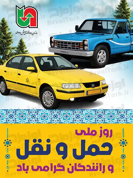 دانلود طرح پوستر هفته حمل و نقل و رانندگان، این طرح را با کیفیت بالا چاپ کرده و به عنوان یک پوستر کاربردی و شیک از آن استفاده کنید. در این طرح از تصویر با کیفیت تاکسی سمند، فایل png نیسان آبی، لوگو سازمان راهداری و حمل و نقل جاده ای، اسلیمی با کیفیت و متن مناسب استفاده شده است. طراح به راحتی می تواند در نرمافزار فتوشاپ المان های مختلف این طرح را ویرایش کرده و جزئیات دلخواه خود را به آن اضافه کند.